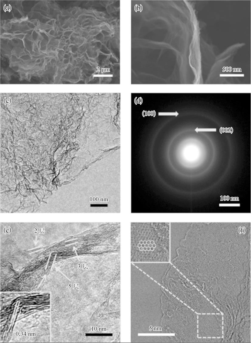 值得注意的是,整个SHS反应只持续几秒钟,并且在整个合成过程中不需要能量输入。该方法的生产规模仅由SHS设备尺寸影响,且后处理过程不产生污染,这为石墨烯的绿色生产开辟了极具吸引力的前景。该方法合成出来的石墨烯由相互连接的少层石墨烯组成,其被整合到交织的骨架中,用来在相邻层之间提供多孔空间[图1-28(a)]。这种连续交联的结构有助于改善石墨烯片的堆叠和片层导电接触。