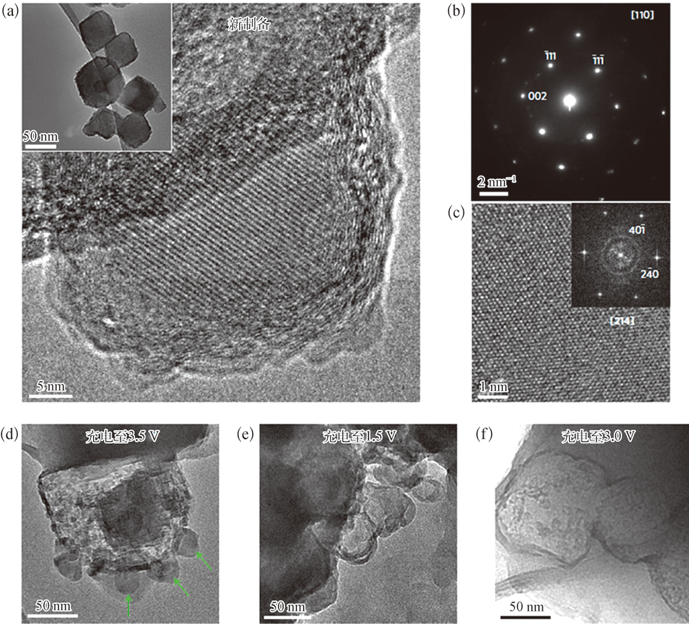 通过TEM的结果[图1-26(a)~(c)]可以看出所合成的物质是Li 2 S@石墨烯结构,在Li 2 S核心周围观察到跨越了10~20个石墨烯层的轮廓层。这种结构最显著的优势在于其非常紧凑,其中石墨烯外壳下方几乎所有可用空间都被Li 2 S纳米颗粒占据。因为Li 2 S是整个电池循环中活性物质密度最小的部分,所以胶囊可允许的膨胀程度最大。紧凑、均匀和完整的石墨烯包覆层有助于在循环过程中将活性物质限制在纳米胶囊中。
