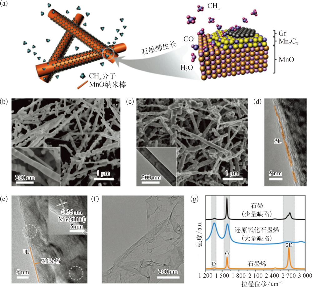 最近,过渡金属氧化物(如MnO)已被证明可催化碳氢化合物的分解并促进石墨烯的生长。2018年,Chen等通过直接CVD法实现了石墨烯在MnO纳米棒上的包覆。他们使用水热法制备的MnO纳米棒作为模板来原位生长石墨烯包覆体。一般来说,在1200℃下锰的氧化物只能被还原成MnO而不是金属锰。有趣的是,MnO在甲烷中可根据下述反应被还原为碳化锰