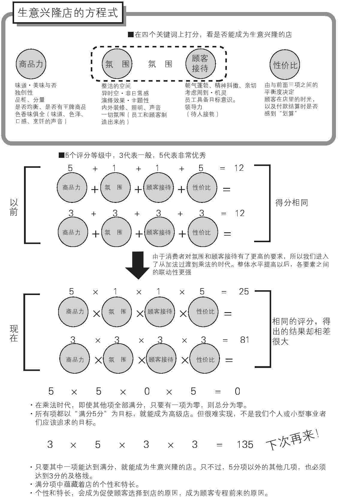 要想让餐饮店生意兴隆,有一定的“方程式”。关键词有四个。这四个项目的评分,5代表非常优秀,4代表优秀,3代表普通,2代表一般,1代表较差。将各项得分累计得出总分。总分越高,越容易成为生意兴隆的店。