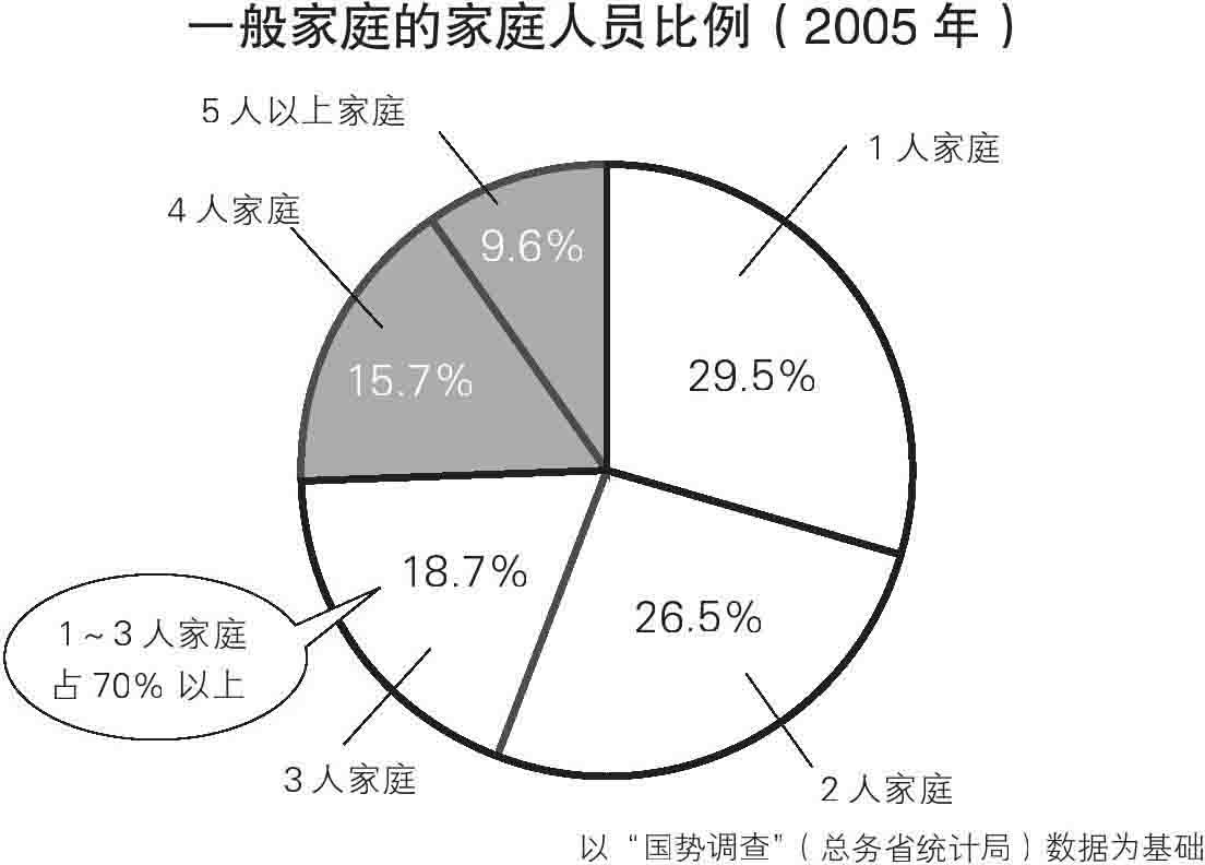 平成十七年(2005年),日本全国平均统计数据显示,单身生活的家庭约占30%,加上两人生活的家庭,两者超过50%,再加上三人生活的家庭,比例才高于70%(每个家庭人数变少的倾向,随着家庭人员年龄增长而增强)。在东京等都市地区,一家一人、一家两人的家庭所占比例更高。