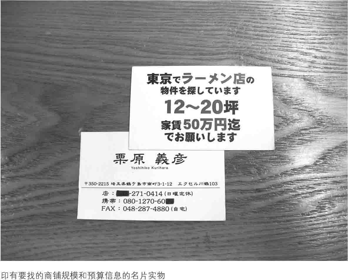 我建议制作一些名片,把自己要找什么规模的商铺,以及预算信息印上去,分发给不动产公司。虽然很多不动产公司会要求在现成的表格上填写信息,但递上一张用于寻找商铺的名片,会给对方留下深刻印象。从尺寸上来讲,也易于对方保存,方便管理,对方以后再联系你的概率会大幅上升。