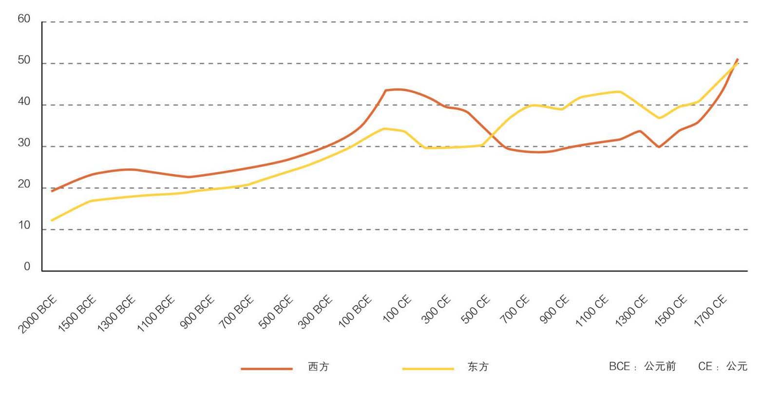 图6 东西方社会发展指数(公元前2000年—公元1800年)