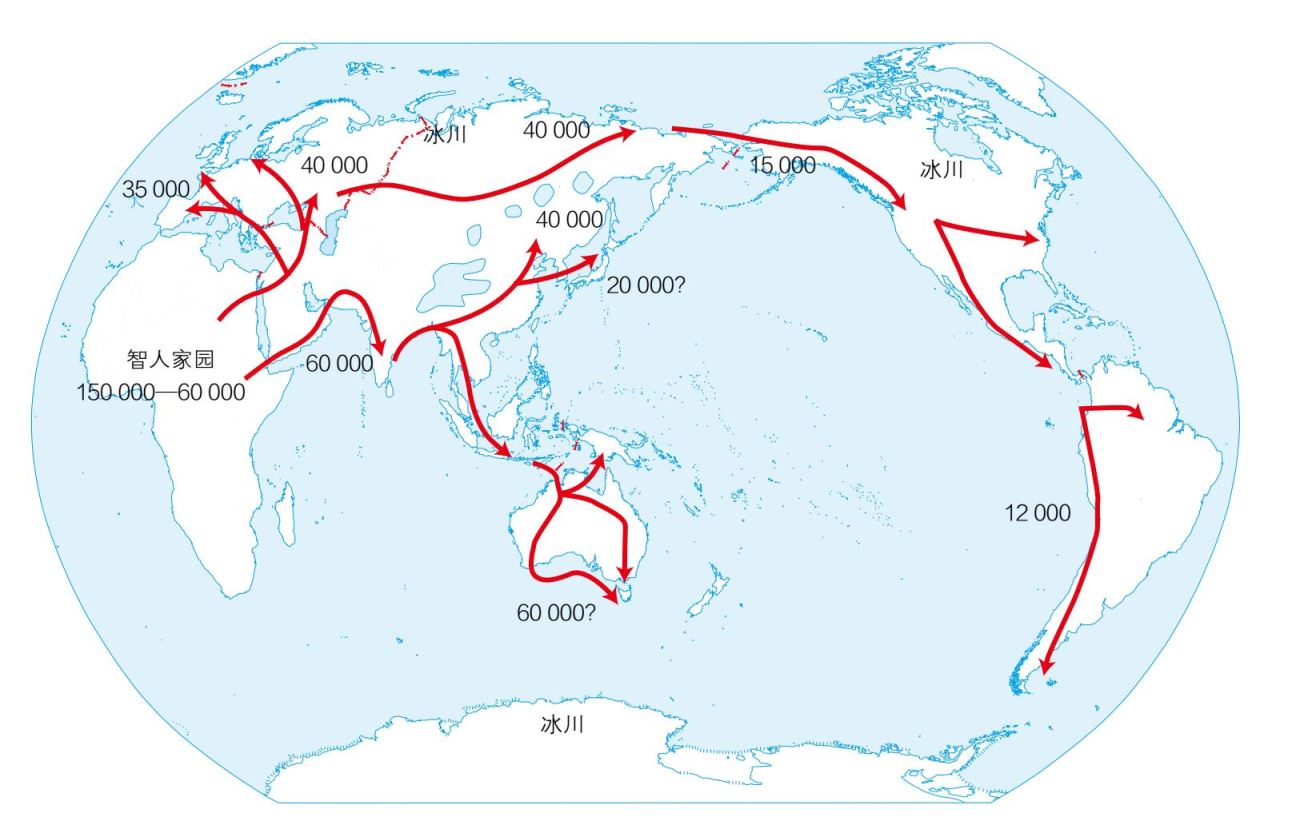 图4 人类走出非洲的路线,及足迹遍及世界各地的时间点