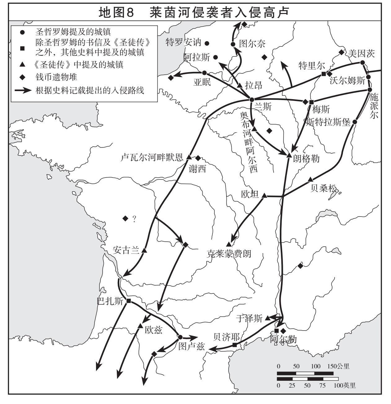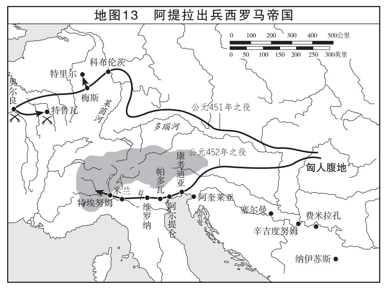 现存史料都没有详细记载这场战役,但我们知道事情的大概。阿提拉的大军离开匈牙利大平原,沿多瑙河上游向西北挺进,随后在科布伦茨地区横渡莱茵河,继续西进(地图13)。据一些公认的非可靠史料记载,公元451年4月7日梅斯城(Metz)沦陷。不久后,帝国的旧都特里尔也沦陷了。然后军队直入罗马高卢的中心地区。到6月时,他们已兵临奥尔良城下。这里是效力于罗马的一支人数可观的阿兰部落总部所在地。城市被重重围困。有史料显示阿提拉希望可以诱使驻守城中的阿兰国王桑吉巴努斯(Sangibanus)转投他的阵营。