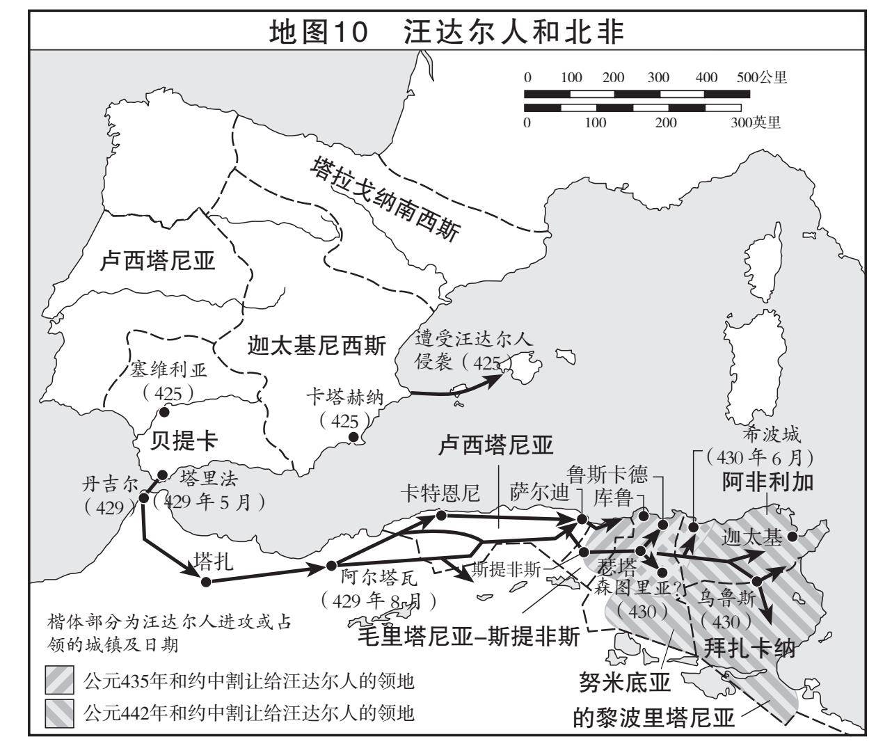 但如果我们置身于事外,从更广泛的角度审视罗马这个国家,阿提拉的战乱尽管破坏巨大,却没有伤及命脉。东罗马帝国主要依赖于小亚细亚到埃及这条弧形地带上富庶行省的税收,而匈人并没有触及这个地区。尽管后者攻城技术先进,东罗马帝国的首都君士坦丁堡有三重陆墙防御,坚不可摧;而匈人也没有海军力量能横渡分隔巴尔干半岛和亚洲富庶行省的狭窄海峡。西罗马的情况类似。如前文所述,西罗马在阿提拉时代已经财政紧张,但匈人的战争机器受制于后勤补给能力,阿提拉无法征服西罗马。事实上,公元376年到408年间,武装移民的涌入对帝国体系所造成的间接影响要严重得多。此外,对西罗马造成真正威胁的也是阿提拉时代所带来的间接影响。因为埃提乌斯专注于对付阿提拉,他就没有足够的时间和资源来应对公元5世纪40年代西罗马面临的其他威胁。与公元451年和452年匈人入侵相比,这些威胁对西罗马帝国造成的损失更大。其中最严重的损失是被迫放弃夺回汪达尔人控制下的北非。