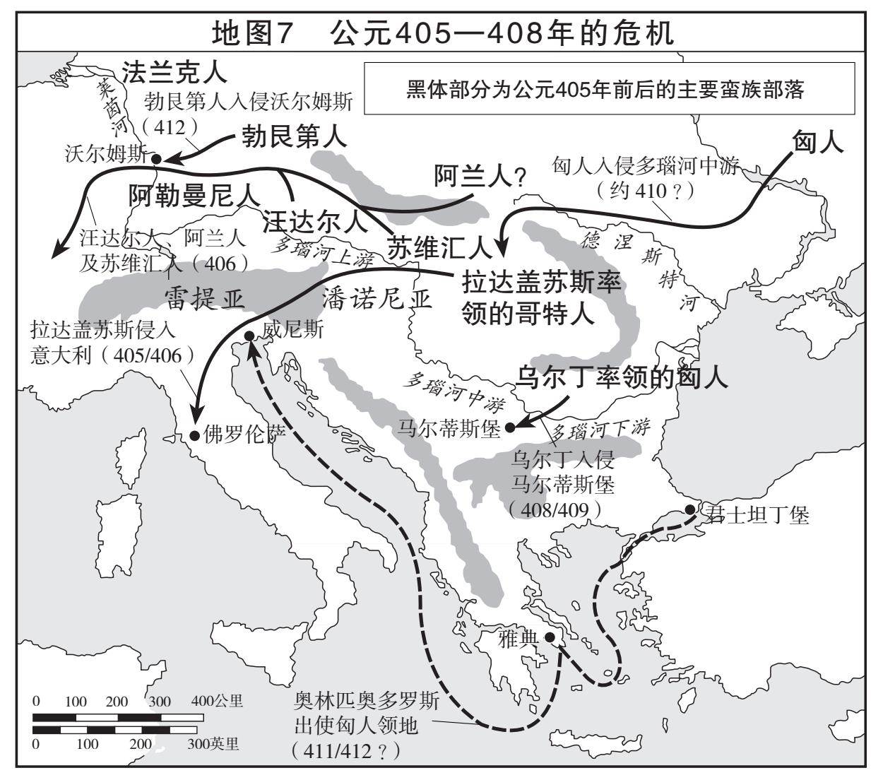 匈人帝国崛起对罗马帝国的全部影响可以分成三个阶段。如本书第四章和第五章所述,在第一阶段中,罗马帝国的边境在公元376年至380年和公元405年至408年间经历两次巨大危机,迫使罗马接受尚未臣服的蛮族在其境内设立飞地。如本书第六章所述,这些飞地的存在反过来又给帝国的政体内部带来极具破坏性的离心力。第二阶段中,阿提拉上任之前,匈人从入侵者转变成欧洲中部的帝国建造者,涌向罗马境内的难民潮也停止了。匈人利用臣服部落,努力控制潜在对手。与此同时,君士坦提乌斯和埃提乌斯能够借助匈人力量,控制那些早前为躲避匈人而移民帝国境内的部落。然而,由于这些部落实际上都未被彻底消灭,第二阶段匈人给罗马帝国所带来的缓和效应并没有超过第一阶段所造成的破坏。