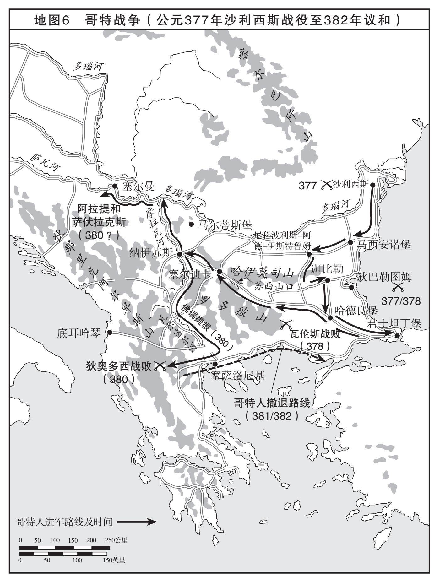 公元376年,哥特人渡过多瑙河,进入已在巴尔干半岛北部统治长达300多年的罗马帝国。公元前146年,罗马征服马其顿,将半岛南部变成罗马的行省,统治了近500年。大体而言,罗马人对巴尔干半岛的地形是加以利用,而非改造。但有一个特例。除了两条联通各地的主干道之外,他们还修建了两条东西走向的道路,横贯巴尔干半岛。在半岛南部,早在公元前130年就已铺设的埃格纳提亚大道(Via Egnatia)久负盛名,自君士坦丁堡沿爱琴海一路向西到达塞萨洛尼基(这段路线的修建还算容易),然后直穿狄那里克阿尔卑斯山的群峰和山谷,抵达底耳哈琴(Dyrrhachium,现在的都拉斯,Durres)。在埃格纳提亚大道北部,公元1世纪末,罗马军团在多瑙河切断喀尔巴阡山处的铁门峡谷(Iron Gates),凿开岩石辟出一条道路,连接多瑙河中游和下游地区。巴尔干半岛连接帝国东西部,罗马在修建干道问题上毫不敷衍了事。即便是在公元376年,对帝国皇帝而言,巴尔干半岛仍主要是连接帝国东西部的桥梁。众多资源被用于维护该地区的道路以及沿途的城镇和驿站。这些城镇和驿站为旅行者提供庇护,还为狄奥法内斯文件中记录的高速旅行提供后勤支持(参见本书第三章)。