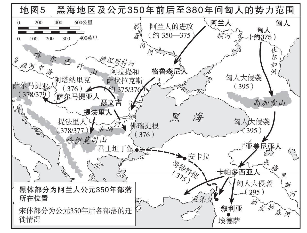 尽管如此,匈人的到来依然给罗马带来了深远影响。虽然多瑙河边界和其他边界一样,经常遭受小规模侵袭,但很少发生战略性变革。在黑海北岸,罗马帝国仅经历过两次战略性变革。气候多样性和生态多样性是这一地区的主要特征。喀尔巴阡山和顿河一带降水充足,尤其是河谷地区,适宜农业耕种,但顿河以东地区种植谷物需要灌溉。而这一带南部、黑海海岸附近的地区则比较干燥,形成大片草原。因此,从生态角度而言,欧洲边缘的这些邻近地区适宜游牧民族和农耕人口的居住。在古代,这一带先后由不同民族占领。公元前的最后几个世纪里,斯基泰游牧民、日耳曼语族的农耕人口和巴斯塔奈人等都在此不断繁衍。公元元年前后,他们的统治被伊朗语族的萨尔马提亚游牧民中断。200年后,农耕民族哥特人向喀尔巴阡山以东、以南推进,将统治向东扩张到顿河一带,制伏残留的萨尔马提亚人。那么,是什么使匈人得以在公元4世纪下半叶恢复这一带的军事平衡,让游牧民族重新统治该地区的呢?