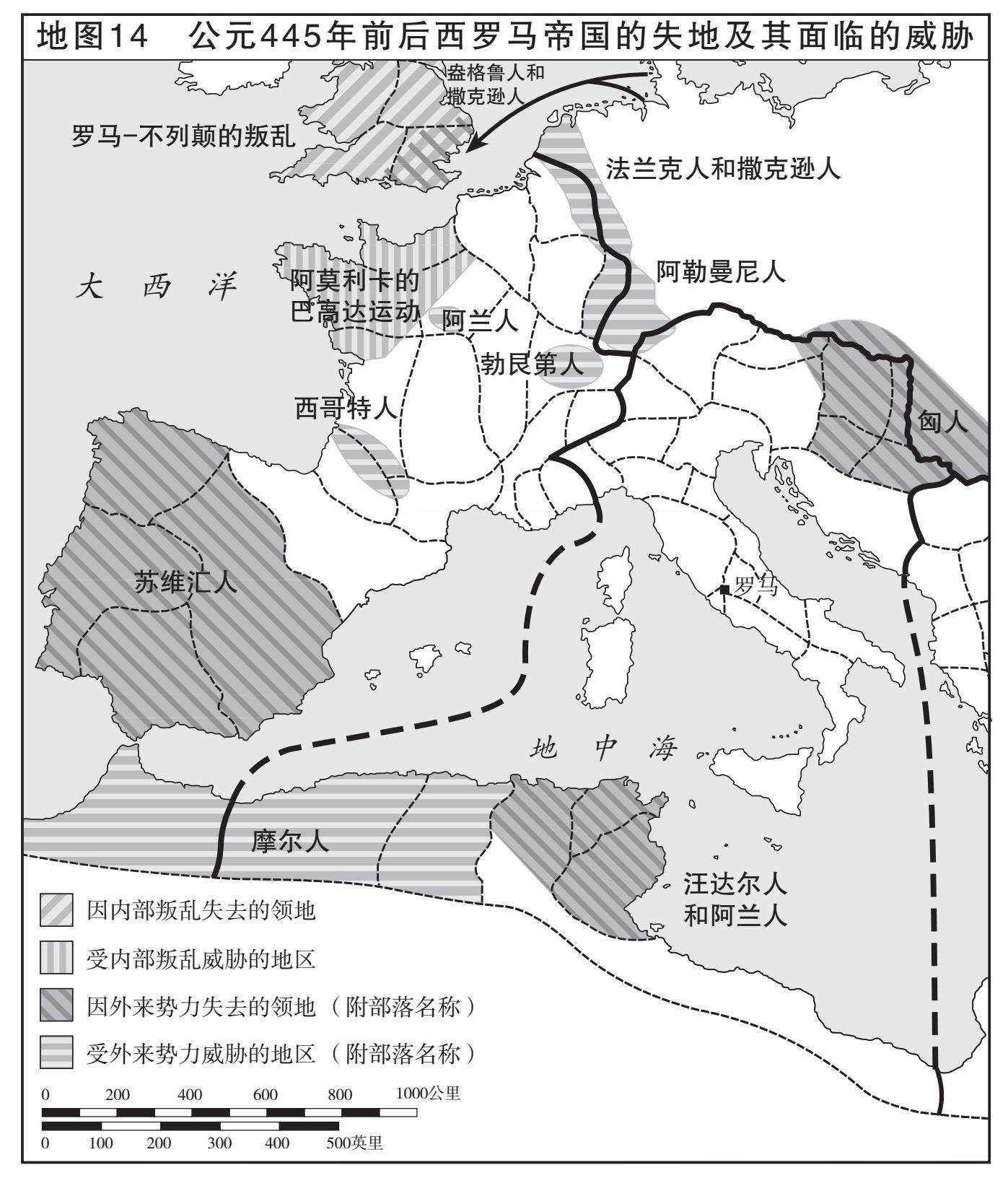 景况暗淡。截至公元452年,西罗马帝国已经丧失大部分的疆域(地图14):不列颠全境、西班牙大部分地区、北非最富饶的行省、割让给西哥特人的高卢西南部,以及割让给勃艮第人的高卢东南部。此外,余下的很多地方在过去的十来年中也经历了严重的战事,来自这些地区的税收肯定也会大幅缩减。
