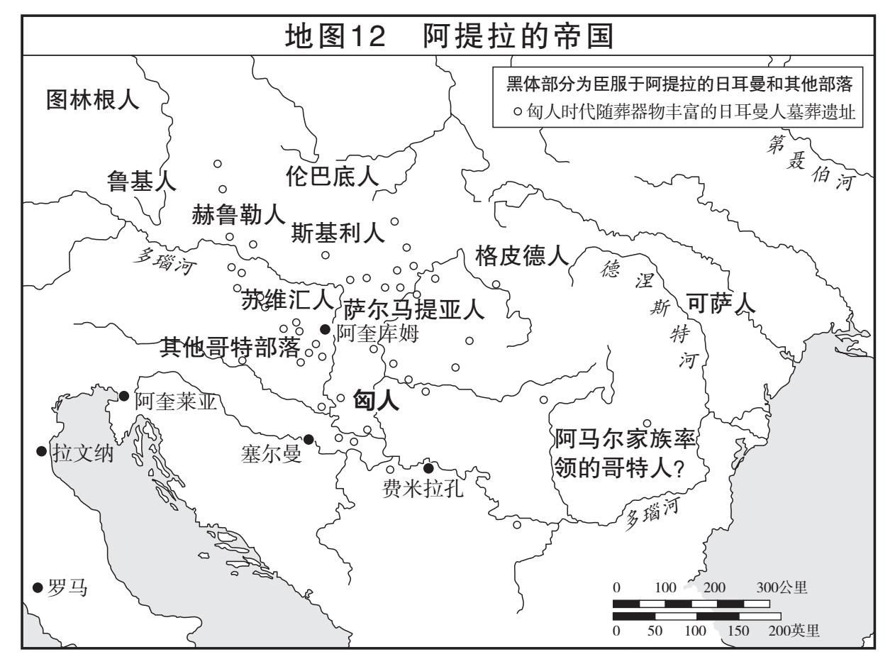 这一点得到考古发现的证实(地图12)。自1945年以来,在匈牙利大平原及周边地区通过发掘墓葬出土了大量随葬器物。这些随葬品可以追溯到匈人统治该地区的时期。(一些宝藏已被发现,但阿提拉的营地仍不见踪影,因为只有支撑柱子的浅槽会留下来。)随葬器物证实“地道的”匈人很难找到。包括黑海北部的伏尔加草原(Volga Steppe)和匈牙利大平原在内,被考古学家鉴定为有可能属于匈人的墓葬总计不超过200座。这些墓葬中有弓、非欧洲风格的服饰