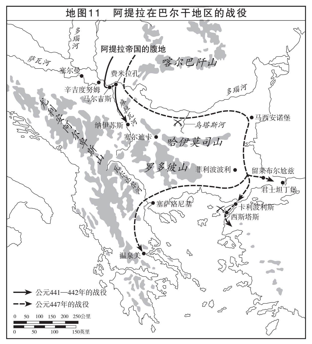 这份名录清楚地表明,匈人帝国旨在兼并人,而非领土。因此,可见阿提拉实际上对于吞并罗马帝国大片领土并没有兴趣。如本书第六章所述,作为同埃提乌斯结盟的代价,他拿走西罗马帝国多瑙河中游的两个行省。但除此之外,他只对在自己与东罗马帝国之间建立封锁线感兴趣。虽然有很多编年史简要地将阿提拉的军队称为“匈人”或者(如果用古体写的话)“斯基泰人”,但从各种史料的详细描述中可以看出,他的军队明显跟之前那些不那么强大的首领的军队一样,都是混编的,由匈人军队和并入匈人帝国的其他部落派出的军队组成。