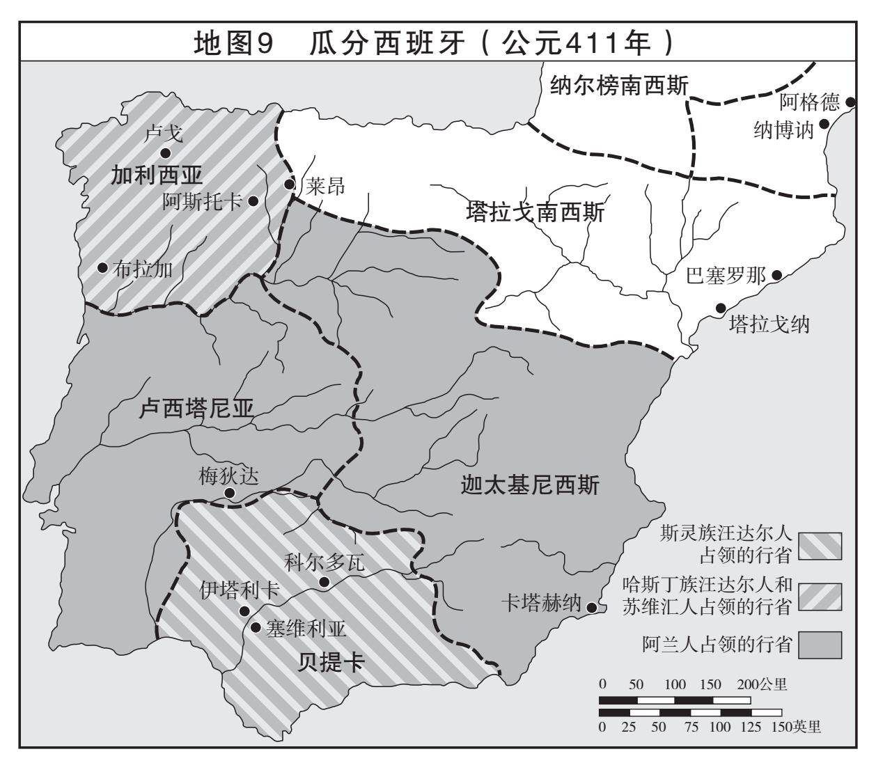 在这种情况下,遗憾的是埃提乌斯无法向伊比利亚半岛提供任何援助。公元429年汪达尔人离开时,伊比利亚才在一定程度上恢复罗马秩序,公元5世纪10年代丧失的税收也被部分收回。西班牙各行省富饶发达,虽不及北非富庶,仍然是西罗马国库的重要财源。在公元5世纪10年代,半岛的大部分地区都脱离罗马的直接掌控。除东北部的塔拉戈南西斯(Tarraconensis)仍受帝国统治外,汪达尔人、阿兰人和苏维汇人瓜分了半岛的其他地区。公元429年之后,仅有苏维汇人还有大量人口没有迁走,盘踞在西北部最落后的加利西亚丘陵地带。埃提乌斯和他的前任一样,乐于将他们留在那里,认为没必要浪费宝贵的兵力将其收复。
