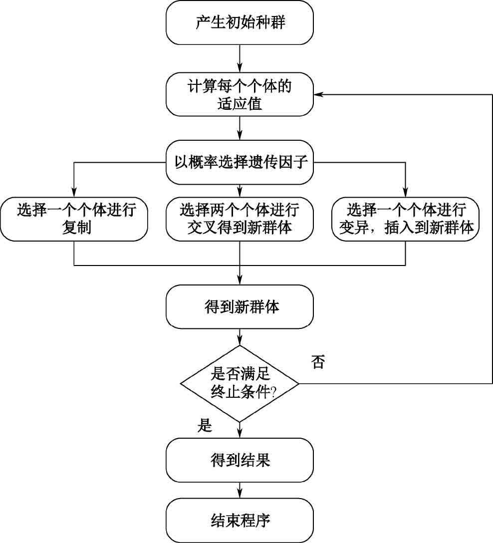 (6)终止条件判断:若 t = T ,则以进化过程中所得到的具有最大适应度的个体作为最优解输出,终止计算。