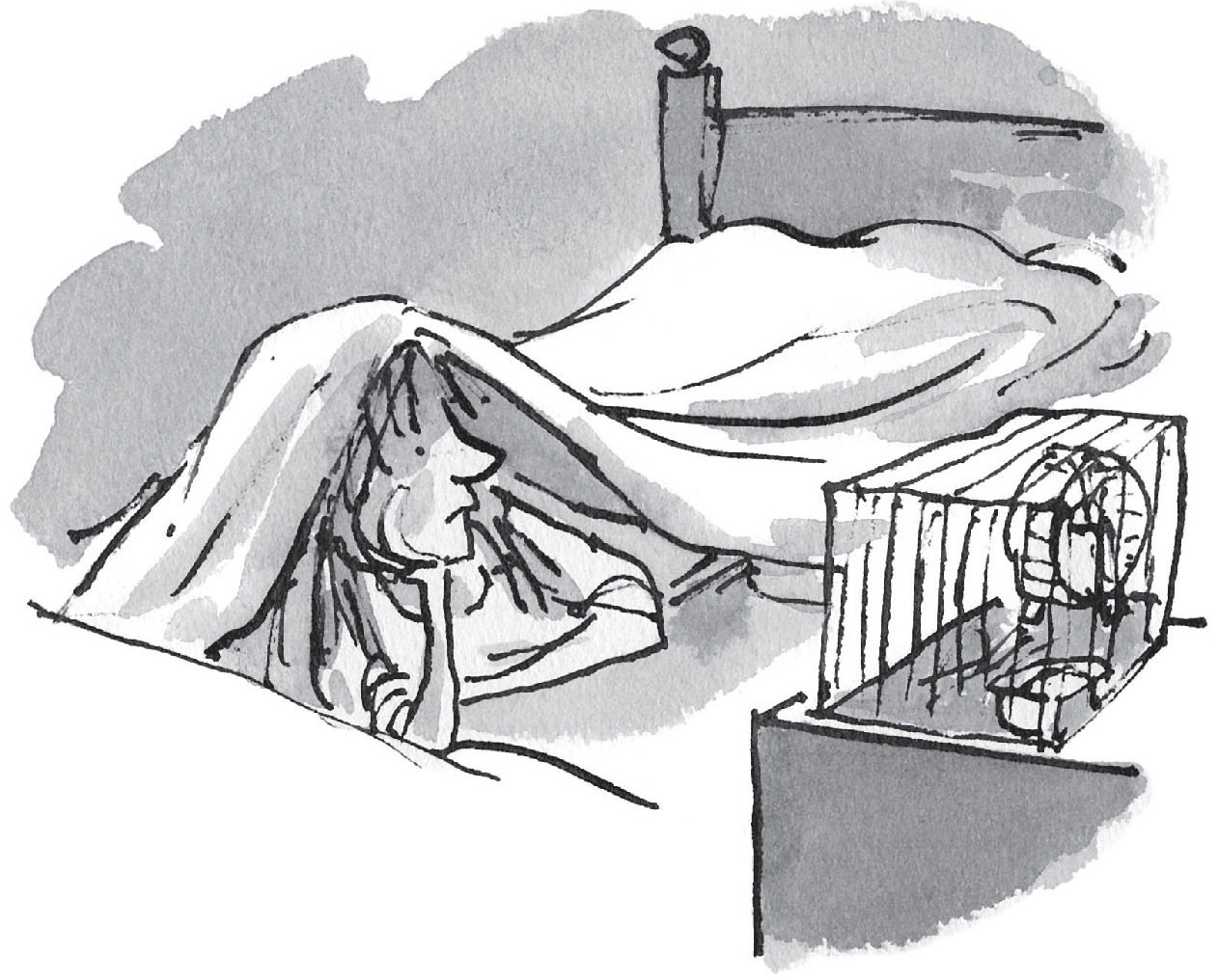 她的心都要碎了。她把眼睛闭上,但却无法入睡。她的心一阵阵发疼,脑子一阵阵发蒙。她伤心,她生气,她难过,她愤怒,她悲痛欲绝。她把身子转向左侧。也许面对着脏兮兮的墙壁会比看着空荡荡的笼子更容易入睡。她把眼睛再一次闭上,但脑子里想的还是小姜饼。