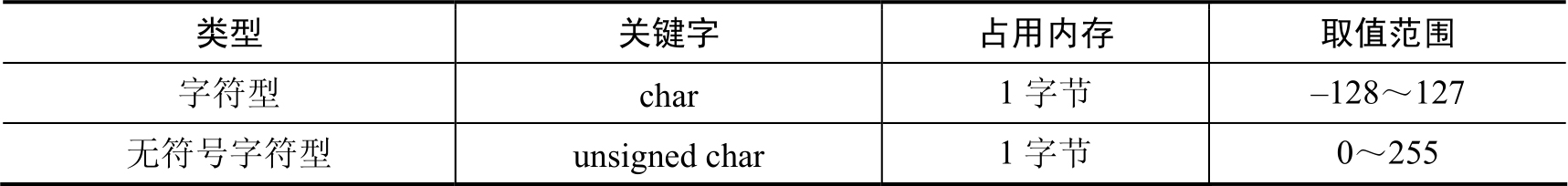 表2.5 字符型内存大小和取值范围