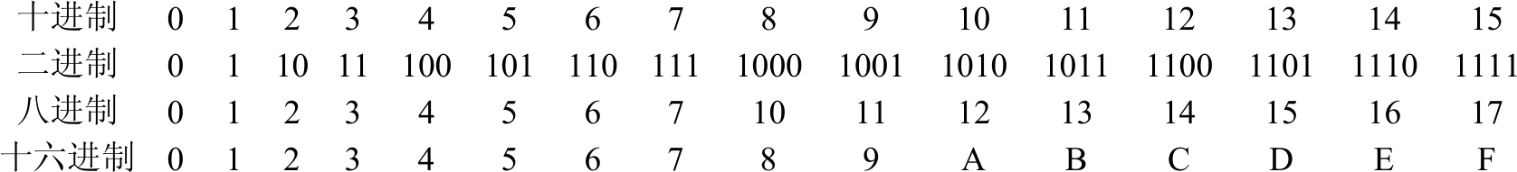 十进制的规则是逢十进一,它的每一位都是由0~9的数字构成。对应的二进制的规则就是逢二进一,它的每一位只能由0或1构成。此外,在C语言中除了二进制,还有可能会用到八进制和十六进制。所以对于“10”,如果它是十进制数,就是10;如果它是二进制的话,那么它所对应的十进制数就是2;若是八进制,对应的十进制数就是8;若是十六进制,则其对应的十进制数就是16。下面列出十进制数0~15所对应的二进制、八进制和十六进制数值。