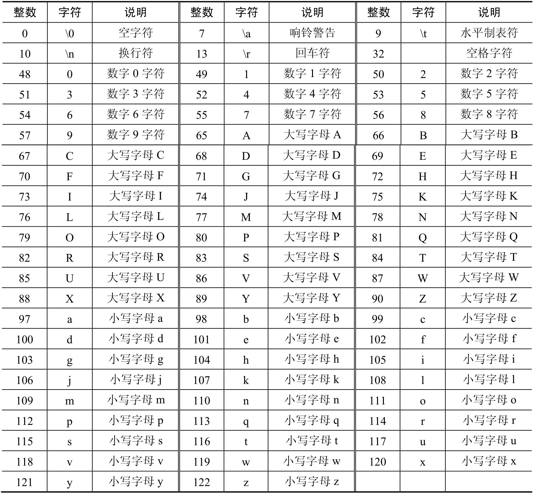 表2.4 ASCII常用字符与整数对照表