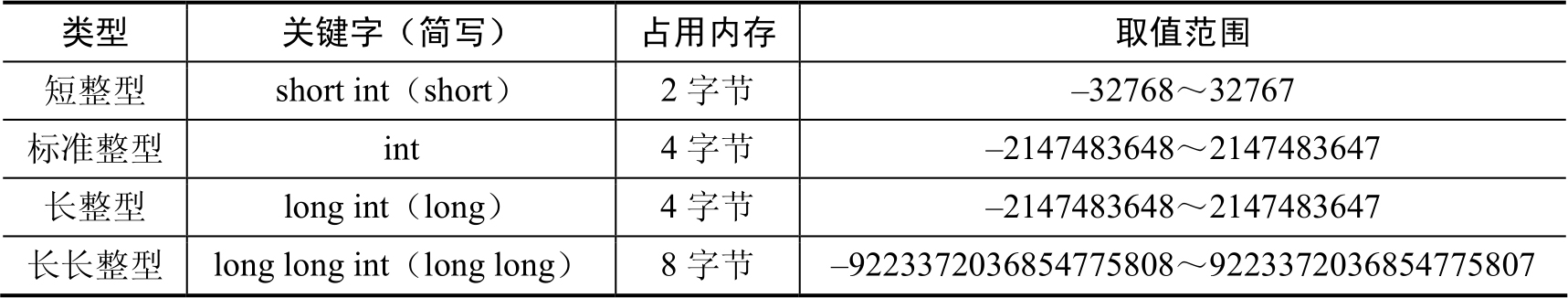 表2.1 整型的内存大小和取值范围