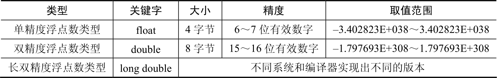 表2.3 实型的内存大小和取值范围