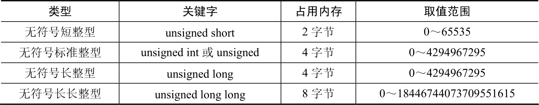 表2.2 无符号整型的内存大小和取值范围
