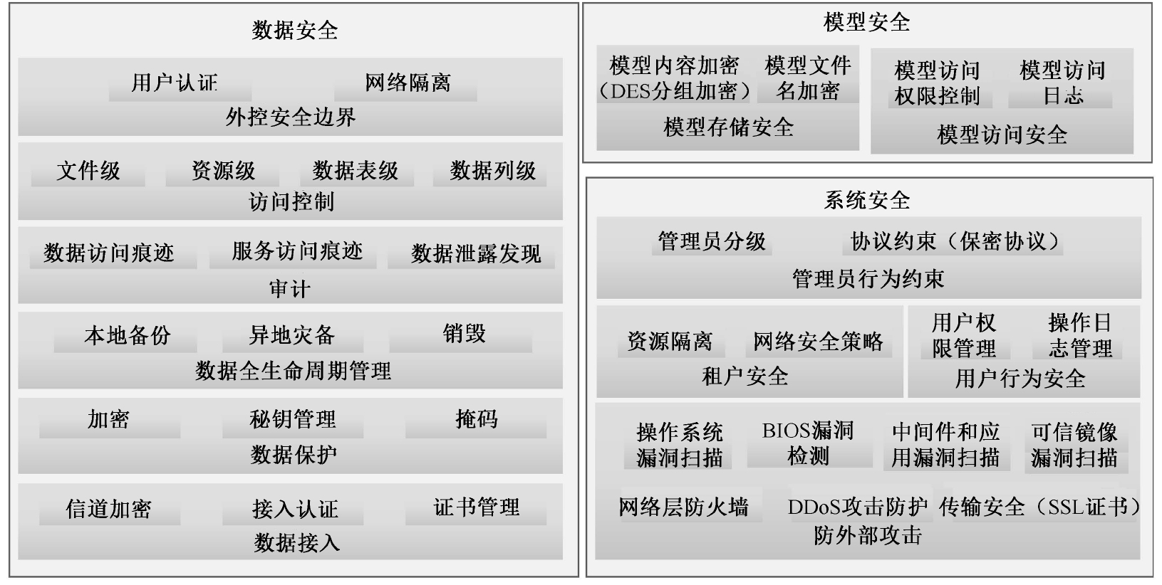 工业大数据蕴含工业生产的详细情况及运行规律,承载了市场、用户、供应链等重要信息,是工业企业的核心机密,也是工业互联网的核心要素。因此,需要在数据存储层和运行分析工具时建立统一的安全管理机制,实现对数据的细粒度和全生命周期安全管控;模型资产等知识产权的保护应通过文件级别的高级加密标准进行加密。需要在数据安全、模型安全和系统安全等方面统一考虑系统安全架构,如图1-6所示。数据安全是关键,模型安全是必需品,系统安全是根本,最终的实现需要从技术和管理两个方面进行保障。