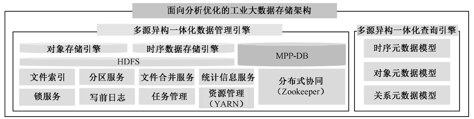 根据数据来源,可以将工业大数据分为3类 [14] :第1类是与企业运营管理相关的业务数据,这类数据来自企业信息化范畴;第2类是设计与制造过程数据,主要指在工业生产过程中产生的装备、物料及产品加工的工况状态参数、环境参数等数据;第3类是企业外部数据,包括产品售出后的使用情况、运营情况等数据,还包括大量用户数据、供应商数据、互联网数据等。工业大数据的这些特性对多源异构数据存储技术提出了很高的要求,不仅需要高效的数据存储优化,还需要通过元数据、索引、查询推理等进行高效且便捷的数据读取,实现多源异构数据的一体化管理。