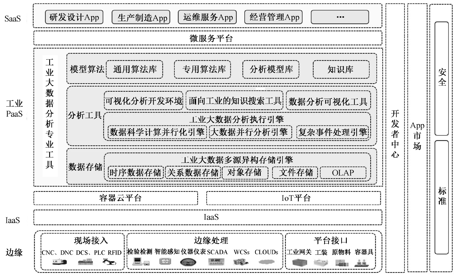 为有效支撑海量多源异构工业数据的存储与查询,有机融入现有知识、经验与分析资产,并消除技能割裂对工业大数据应用和发展的制约,需要构建一套能够支撑工业大数据分析的工业大数据平台及技术,工业大数据平台架构如图1-3所示。