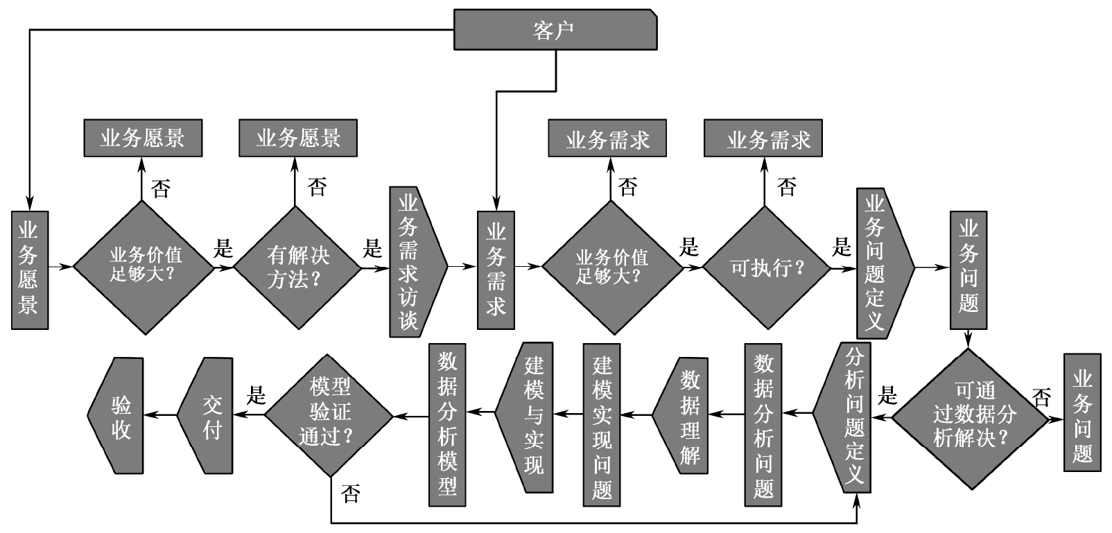 (1)业务规划类:只有大概业务愿景或目标,如用大数据提高产品质量、用大数据构建精加工工业互联网(向第三方开放自己的精加工能力)等。此时需要业务分析师与客户一起从业务角度分解业务愿景,并将其总结为若干数据分析问题。