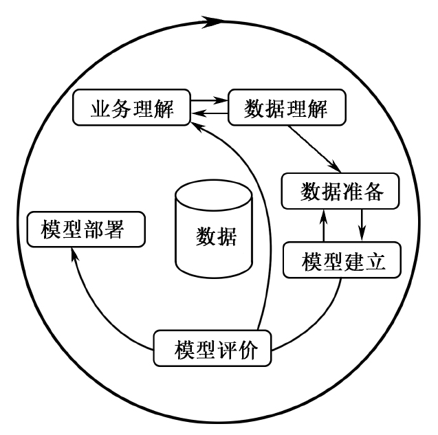 CRISP-DM是一种得到广泛应用的数据挖掘方法论(其他方法论请参考文献[1]),由SPSS、Teradata等公司于1999年发布第一版。该方法将大数据分析分为业务理解、数据理解、数据准备、模型建立、模型评价、模型部署6个阶段,如图3-1所示 [2] 。与一般的IT项目不同,分析项目的不同阶段之间存在很强的迭代关系。