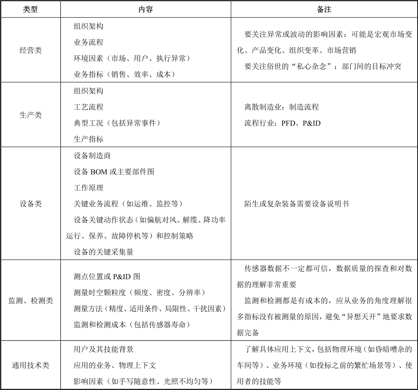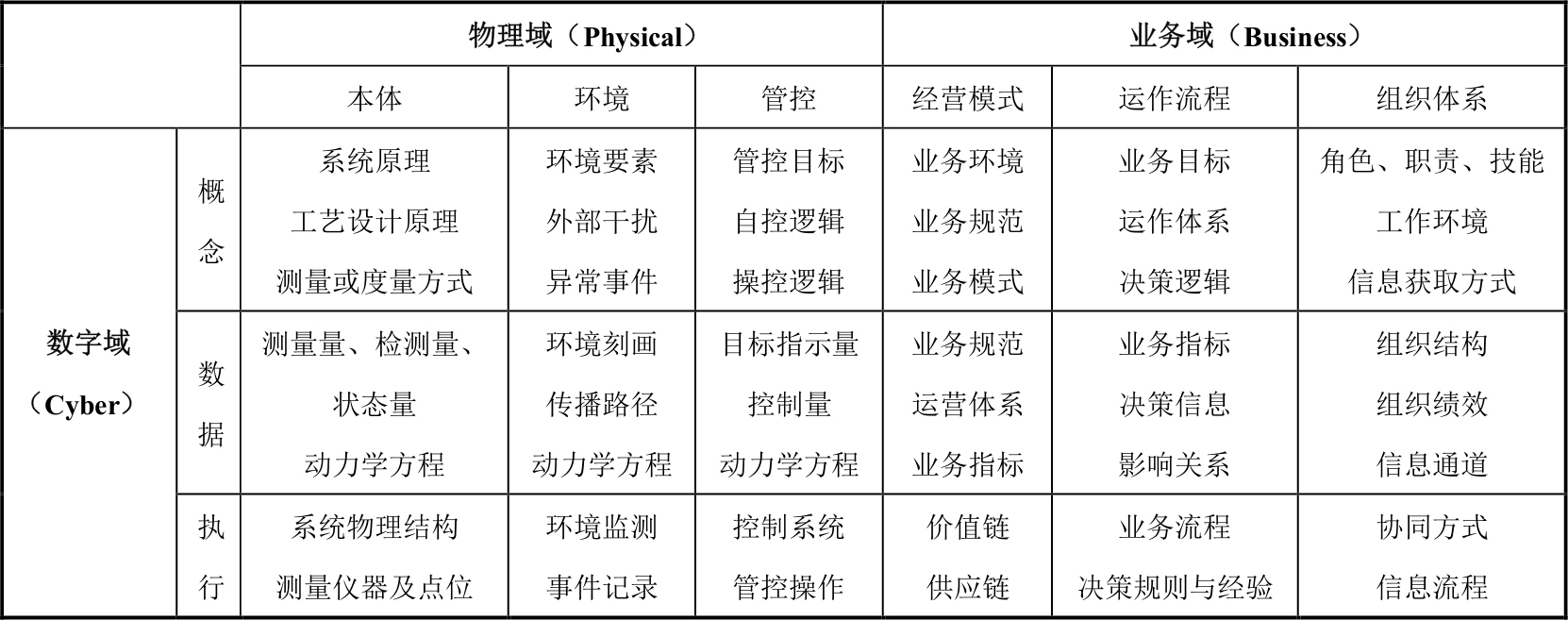 工业系统涉及物理域(Physical,物理世界的运行规律)、业务域(Business,业务经营与管理)和数字域(Cyber,信息领域的刻画)。因此,工业大数据分析的上下文理解也要从这3个维度入手,将每个维度细化,并形成工业大数据分析的上下文理解框架,如表3-1所示。在数字域,可以分为概念、数据、执行3个层面,概念层面进行定性但全面的了解,数据层面从定量化的角度描述要素,执行层面回到物理世界,从落地的角度进行理解。对于一个具体问题来说,只有从不同颗粒度(至少从当前颗粒度、高颗粒度、低颗粒度)进行具象分析,才能在问题筛选与定义时做到收放自如。