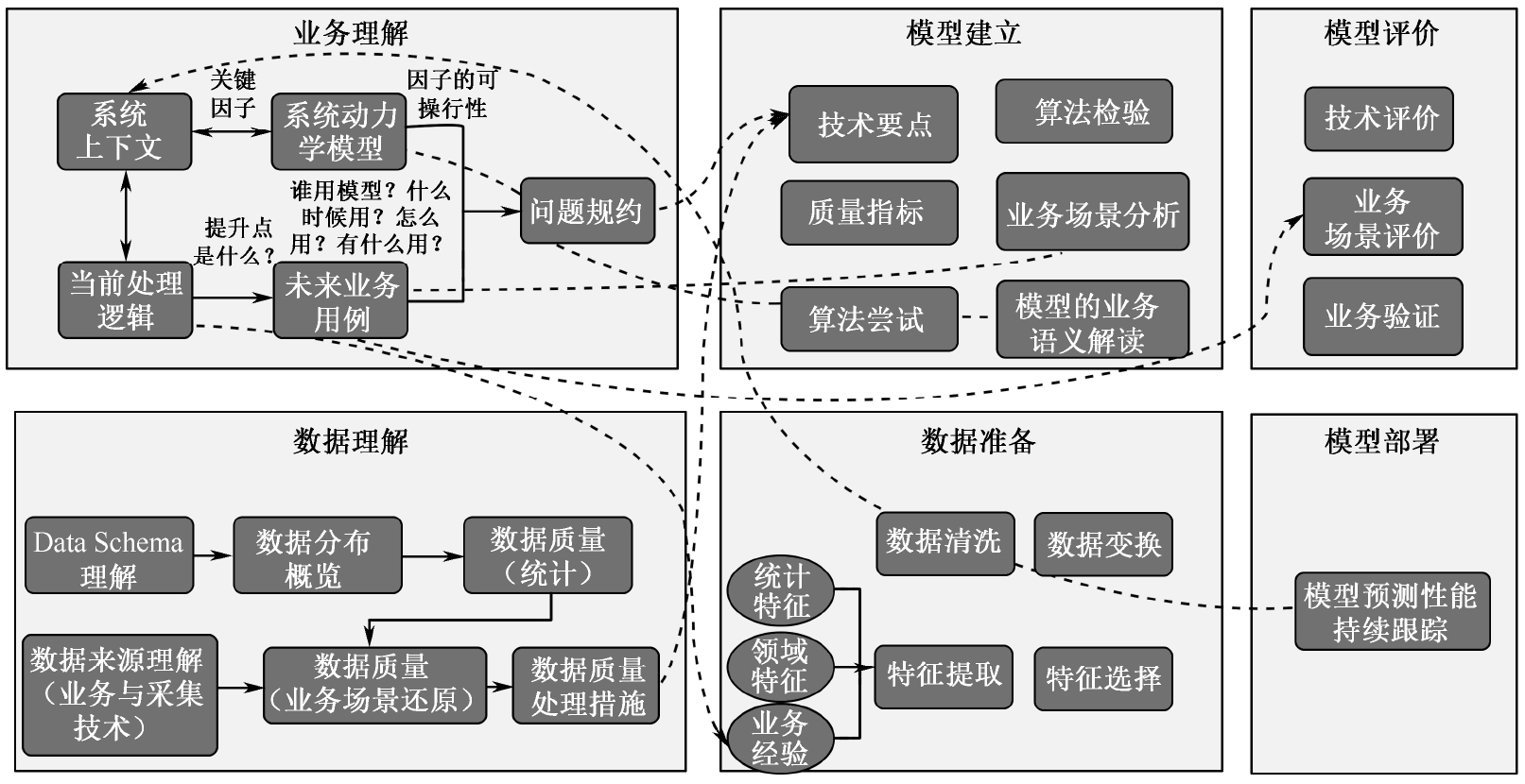 在CRISP-DM方法论中,这一阶段从业务的角度理解项目的目标和需求,并将其转化为可解的数据分析问题,可采用业务流程建模、决策建模等方法分解业务目标、分析业务用例、找寻关键因素、确定分析问题的范围。