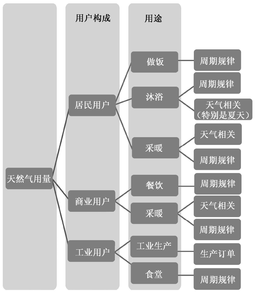 (1)假设(Hypothesis):基于机理或先验知识,猜测存在某种关系或规律,需要用数据证实或证伪。例如,在居民燃气负荷预测中,假设居民用气的主要构成是做饭、沐浴等日常生活需求,那么居民用气应该存在明显的时(周期性、季节性)空(不同地区、不同小区类型)规律,也会受天气等外部因素的影响。因此,数据分析的重点在于验证这些假设可以在多大精度上预测用量。