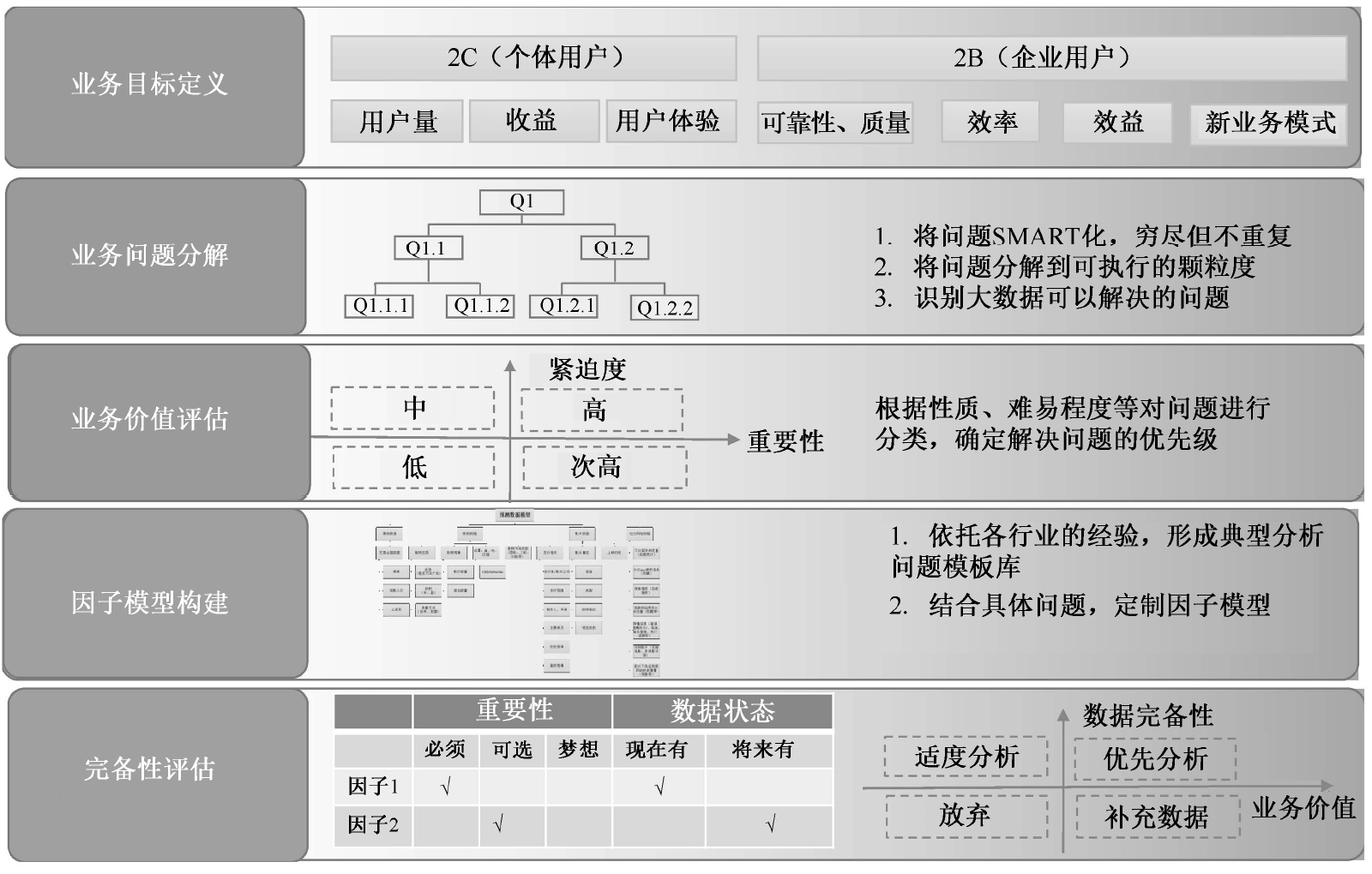分析课题识别与定义首先要对行业和企业的基本面有全面把握(即上下文理解);其次,充分利用行业参考模型(如质量管理中的PDCA、6-sigma等方法论框架 [2-4] )、管理工具(如Value Chain Analysis等 [5-6] )、分析方法(如5W2H、MECE原则等 [7] ),将业务需求转化为数据分析问题;最后,形成一个相对清晰的数据分析问题定义。