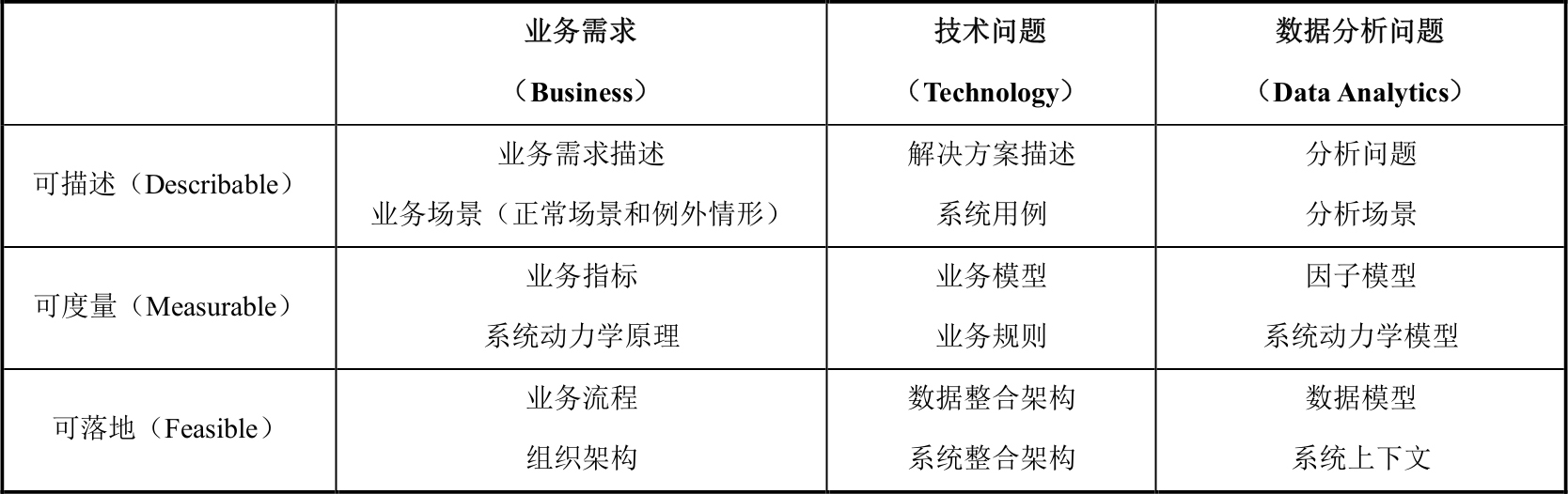 在上下文理解的基础上,通过对比当前状况(As-is)与期望状态(To-be),基于业务理解、行业参考模型(如质量管理中的PDCA、6-sigma等方法论框架)、管理工具(如Value Chain Analysis等)、分析方法(如5W2H、MECE原则等),形成实现跨越差距的若干可行方案。需求转化的考量因素如表3-2所示。