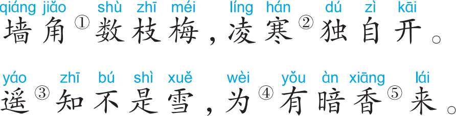 ①角: 角落。 ②凌寒: 迎着寒风。 ③遥: 远远的。 ④为: 因为。 ⑤暗香: 指梅花的幽香。