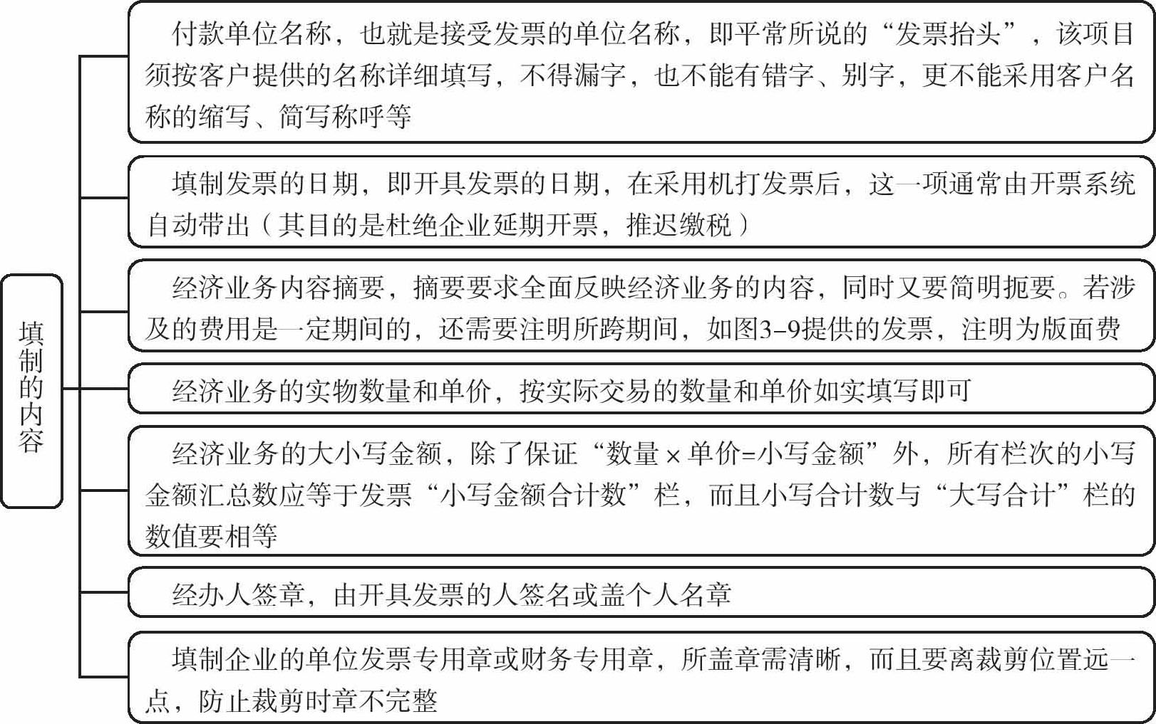 从发票内容可以看出,发票本身包括名称、发票号码等内容,会计人员需要填制的内容具体包括以下几方面。
