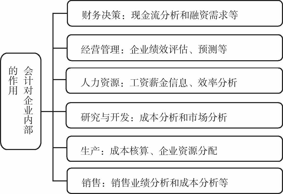实际操作中,会计通过其数据处理,对企业内部的作用是系统且全面的,它在企业内部与研究开发、生产、销售、经营管理、财务决策和人力资源等部门都有着非常密切的关系。