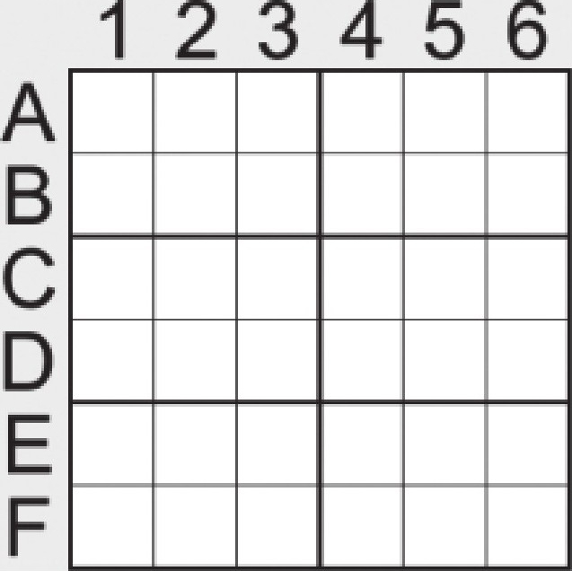 如图所示,我们将盘面中的行用字母A到F表示,列用数字1到6表示,将行的字母和列的数字进行组合,先字母后数字的表达方式即可表达盘面里所有的单元格。例如第3行第2格表示为C2。