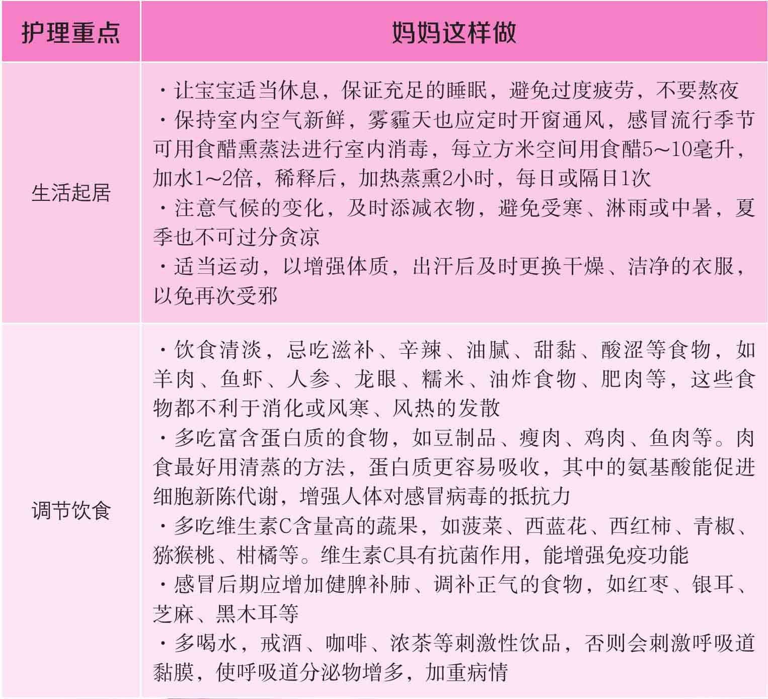 预防: 天气转凉的时候,及时给宝宝添加衣物,避免着凉;保持宝宝居室空气流通,少带宝宝去人多拥挤的公共场所,避免感冒病毒侵袭;多吃易消化的食物,少吃冰箱冷藏的酸奶、饮品和生冷瓜果等。