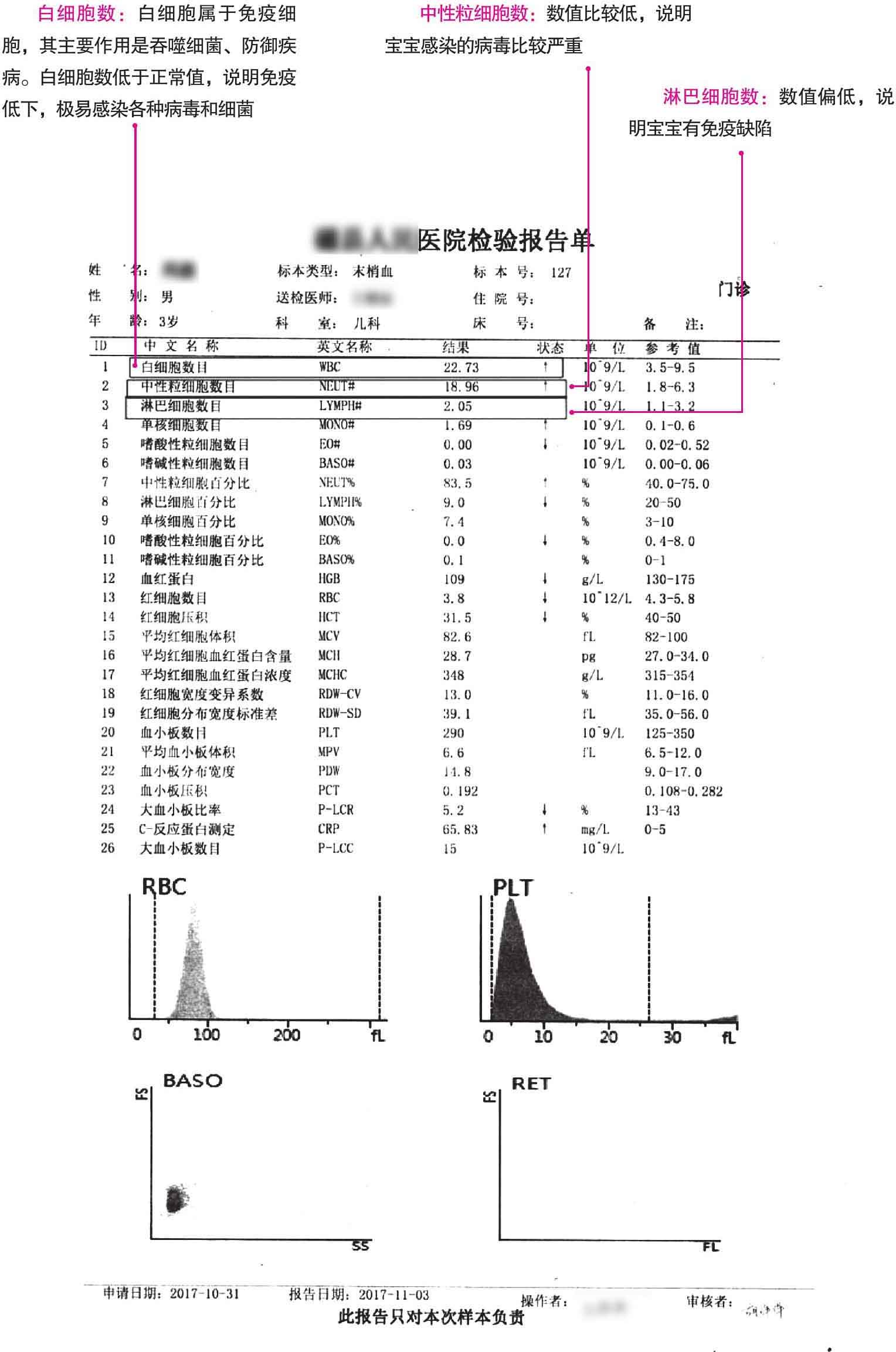 我们第23页出示的那种化验单上方,已经给大家讲了白细胞数、中性粒细胞数和淋巴细胞数三个重要数值的核心含义。一般来说,白细胞计数不高或降低,淋巴细胞计数或百分比增高,提示病毒感染;白细胞计数和中性粒细胞计数或百分比增高,提示细菌感染。