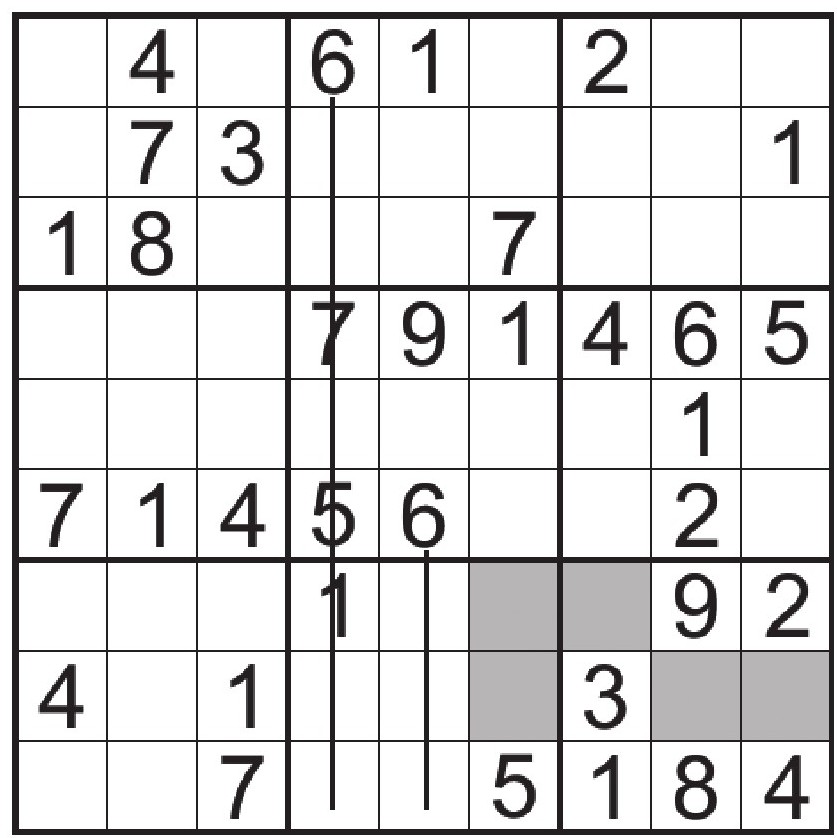这个时候我们会发现,第七宫灰色部分,2和9一定在其中,而6也在其中(在I1和I2里)。那么显然,这个灰色部分构成了一个2,6,9的隐性数组。
