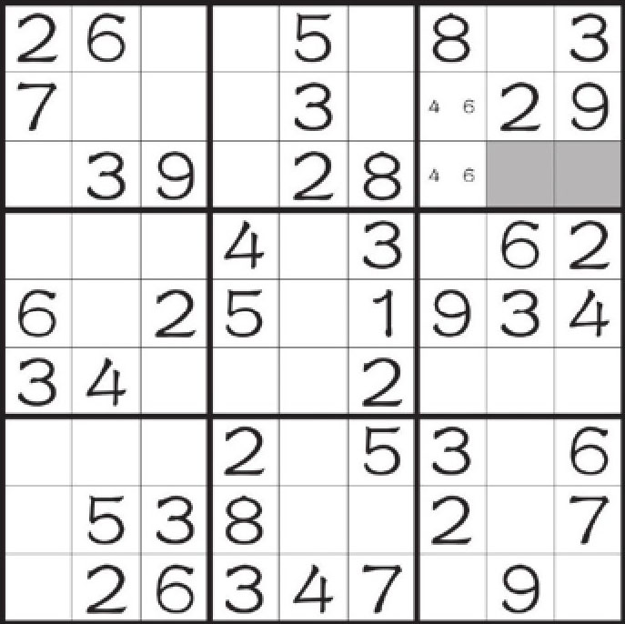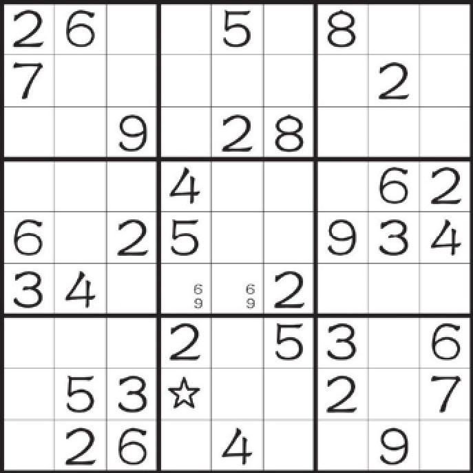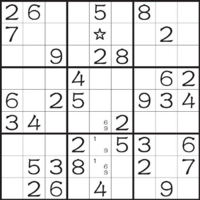 再观察第六行,得到69数对(亦可观察第五宫)。这个数对占位后,得到第四列的8在H4。