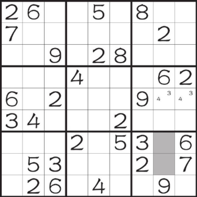继续观察,第六宫有一个34数对,而九宫灰色部分有一个4区块,因此得到这两个数。
