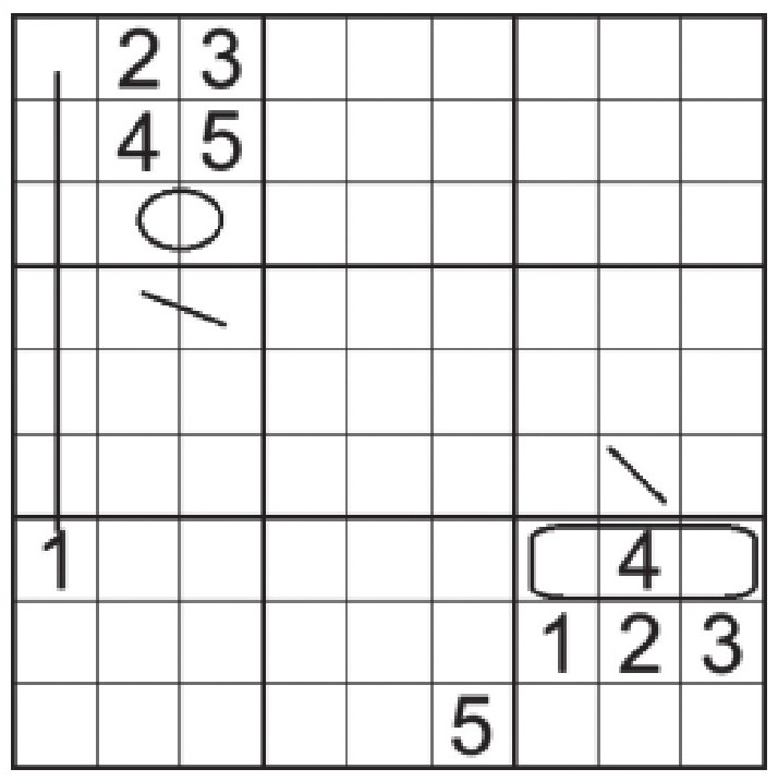 右下角部分,框内的5区块也可以排除F8的5。仔细想一想也可以发现,就算没有G8=4这个条件,5在G7、G8和G9之中时候,F8都不能是5。