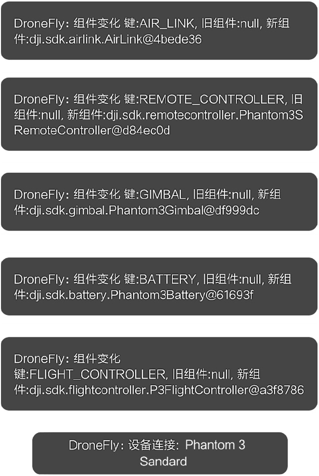 ● onComponentChange(BaseProduct.ComponentKey componentKey, BaseComponent oldCom ponent, BaseComponent newComponent):无人机组件变化回调方法。该回调函数包括3个参数,即组件键(componentKey)、变化前组件对象(oldComponent)和变化后组件对象(newComponent)。组件键用于声明组件类型,为枚举类型变量,包括相机(CAMERA)、云台(GIMBAL)、飞行控制器(FLIGHTCONTROLLER)等类型。