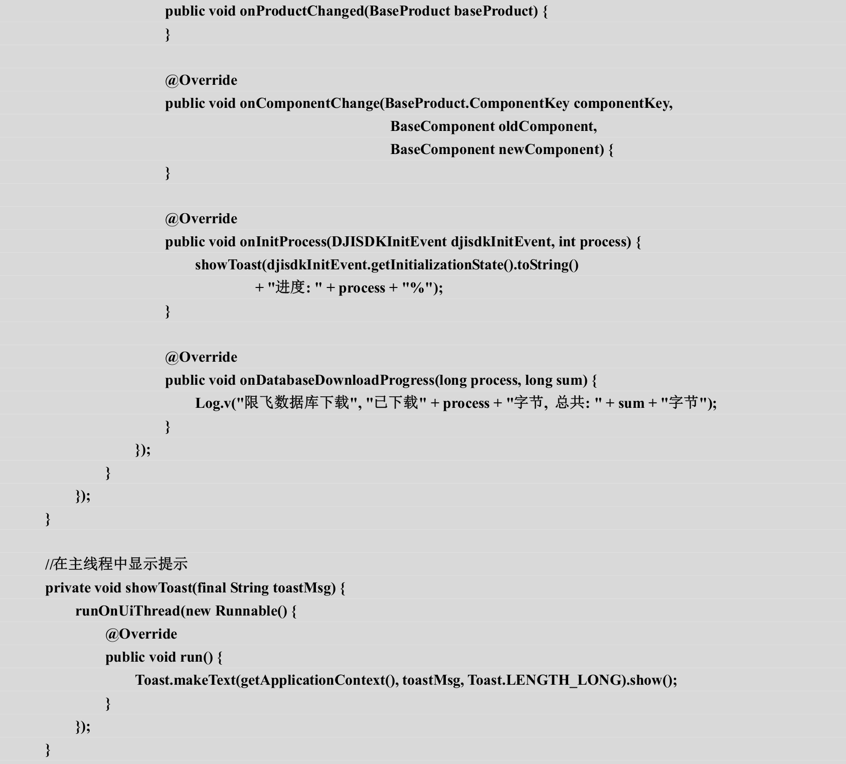 ● onInitProcess(DJISDKInitEvent djisdkInitEvent, int process):初始化进程回调方法。在注册应用程序时实际上也在进行Mobile SDK的初始化,包括资源初始化、限飞数据库初始化等。通过djisdkInitEvent对象的getInitializationState()方法即可获取初始化状态InitializationState。InitializationState为一枚举变量,包括在开始初始化时(STARTTOINITIALIZE)、资源加载完成时(ASSETSLOADED)和限飞数据库加___载完成(DATABASELOADED_)三个状态定义。另外,通过process变量可获得初始化进度,其值域为[0,100]。