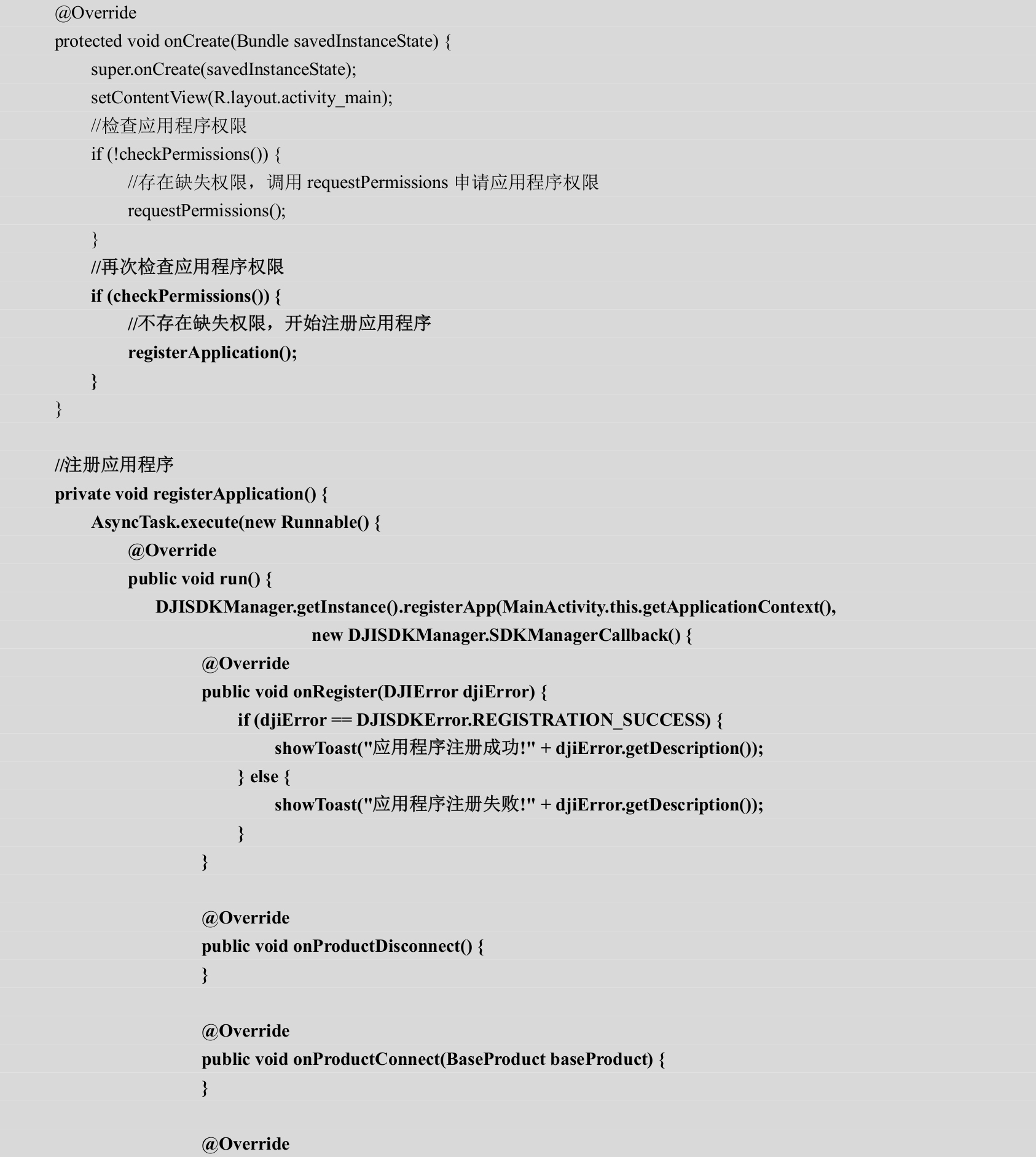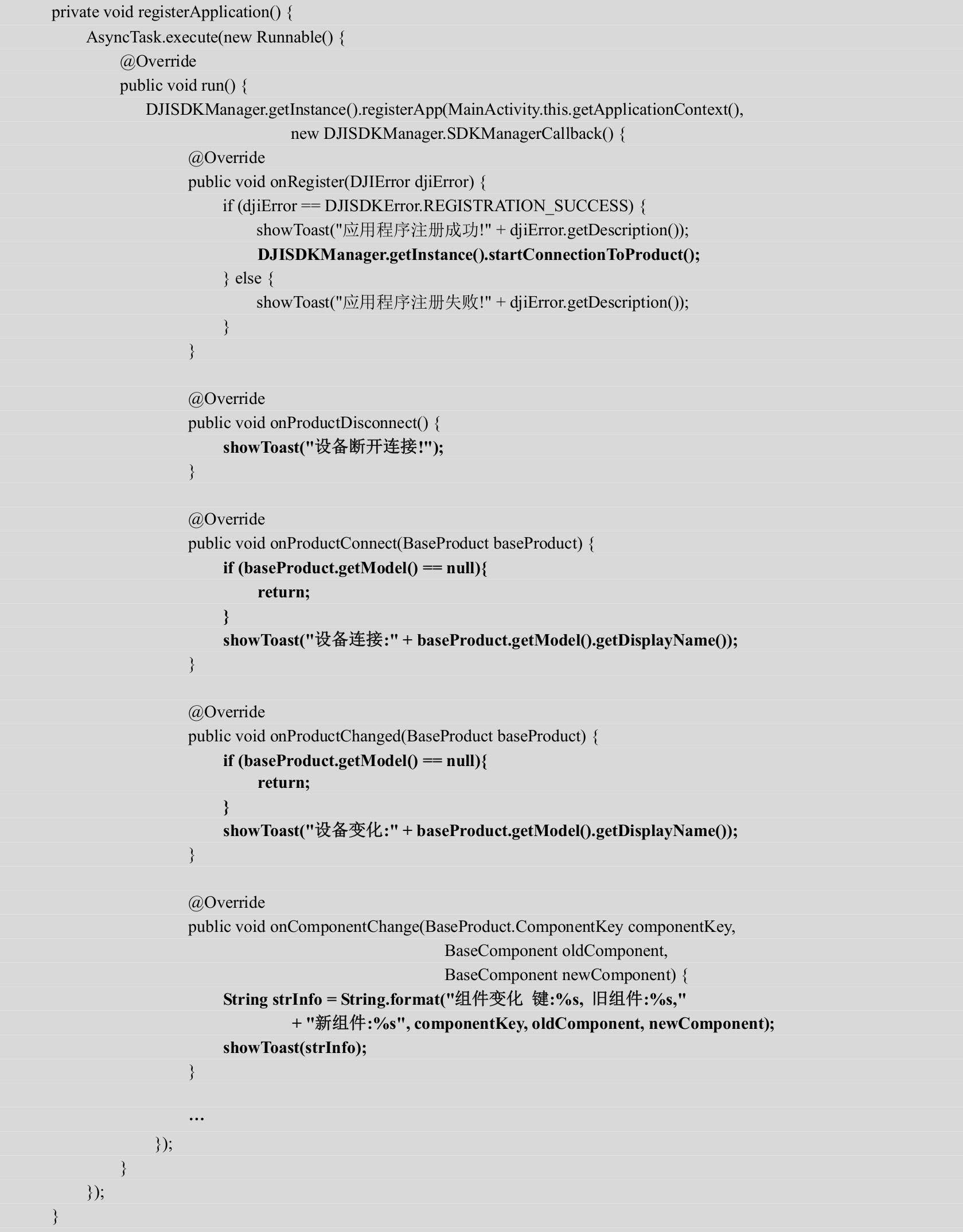 首先介绍通过SDK管理器的registerApp(…)方法注册应用程序,以获得使用Mobile SDK的授权的方法。在使用该方法时,还需要实现registerApp(…)方法的SDK管理器回调(SDKManagerCallback),以判断应用程序是否注册成功。