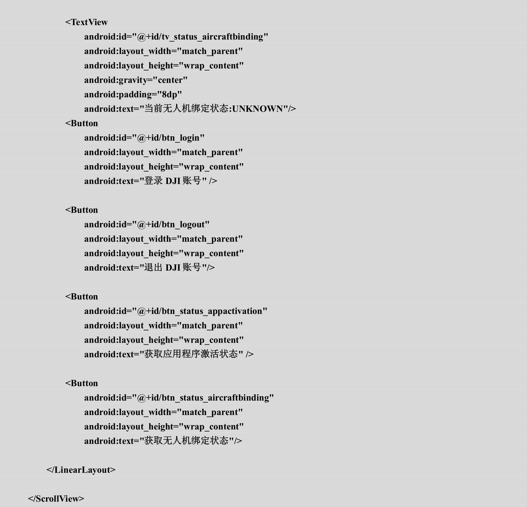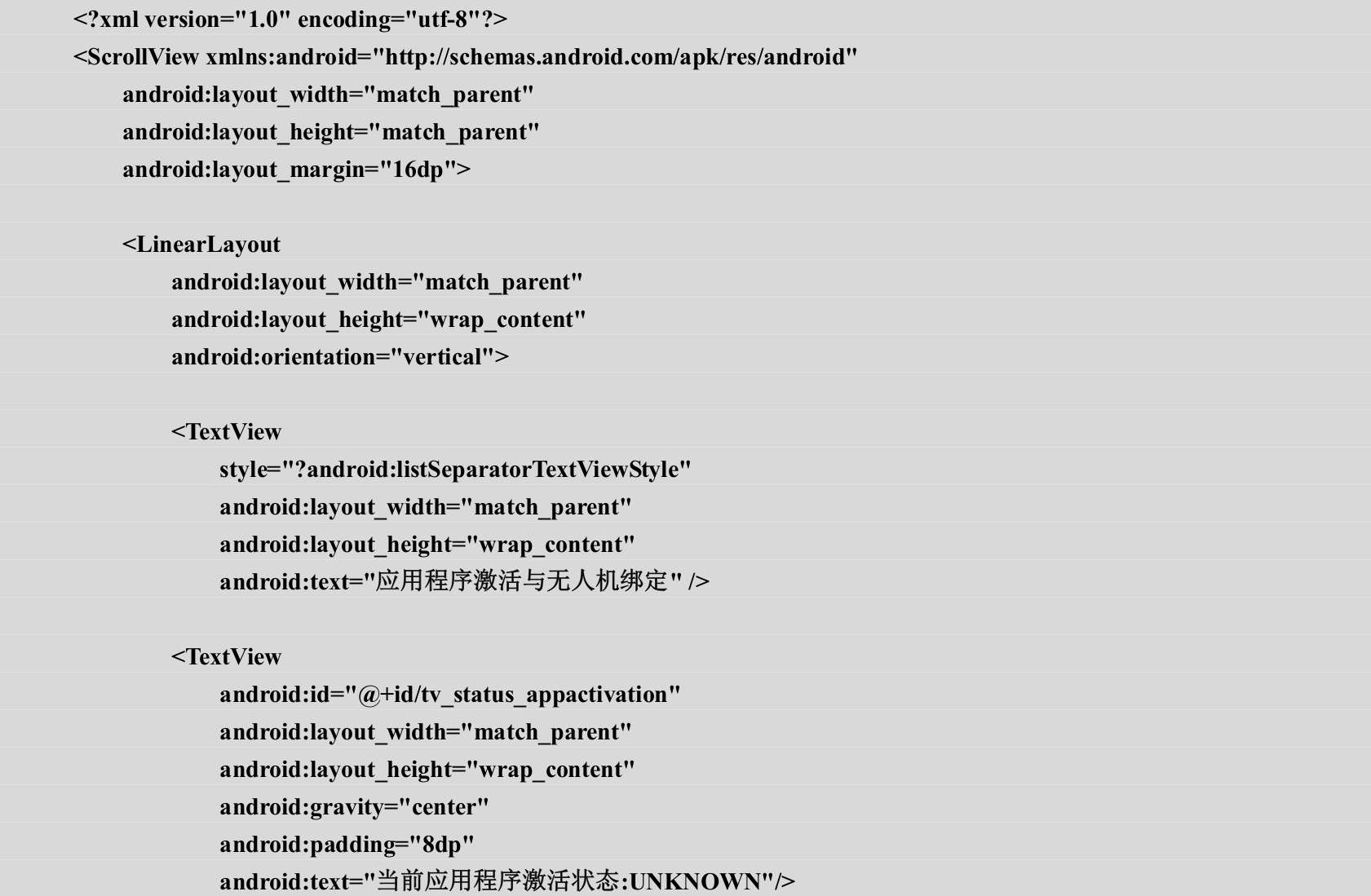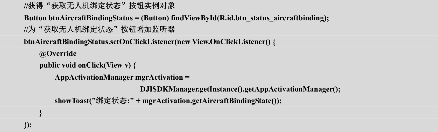 通过应用程序激活管理器的getAircraftBindingState()方法即可获得无人机的绑定状态信息。在MainActivity类的initUI()方法的末尾添加如代码3-14所示的内容。