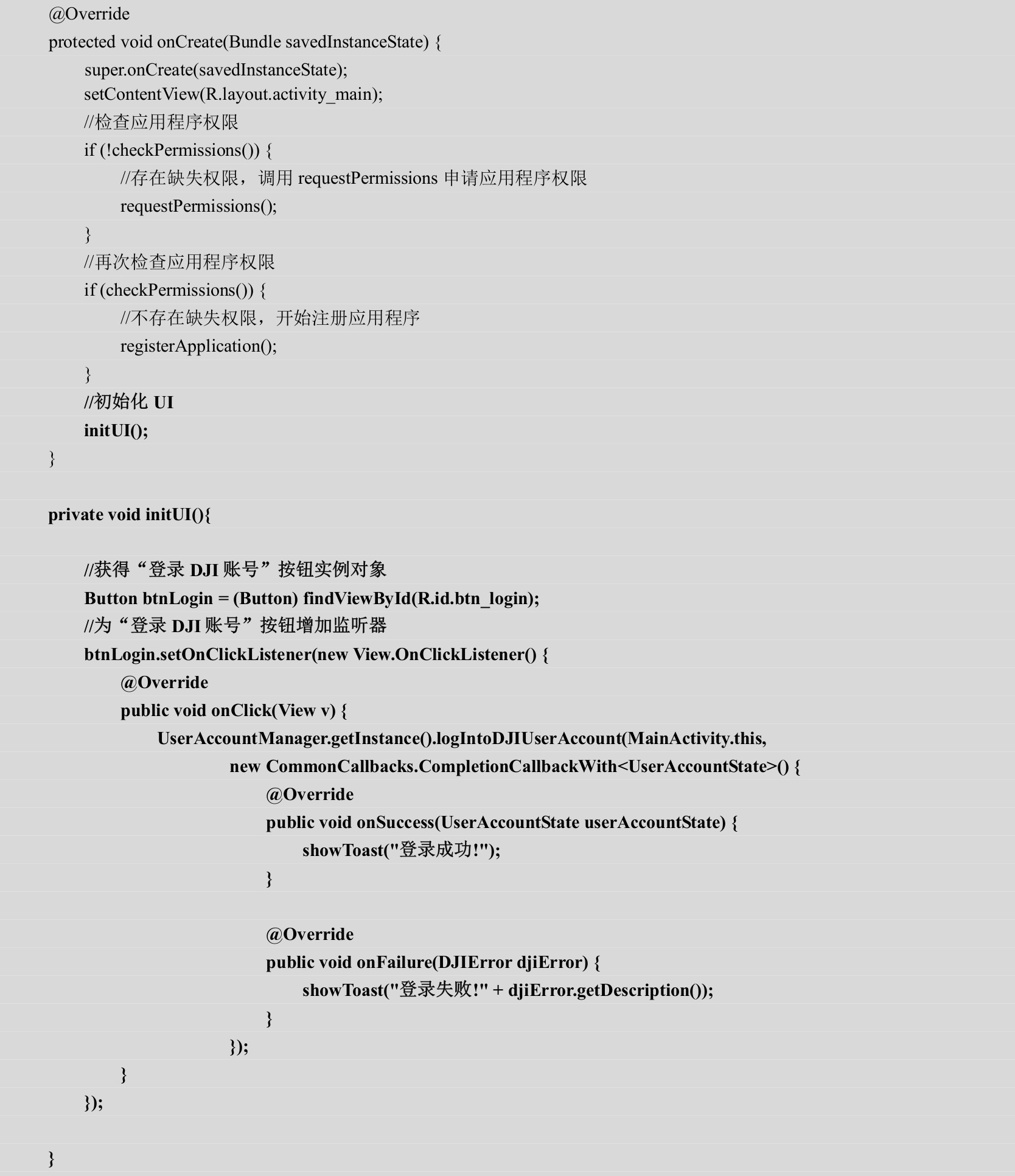 在上述代码中,logIntoDJIUserAccount(…)方法的回调中包含了onSuccess(…)和onFailure(…)两个回调函数。前者在登录成功时回调,后者在登录失败时回调。